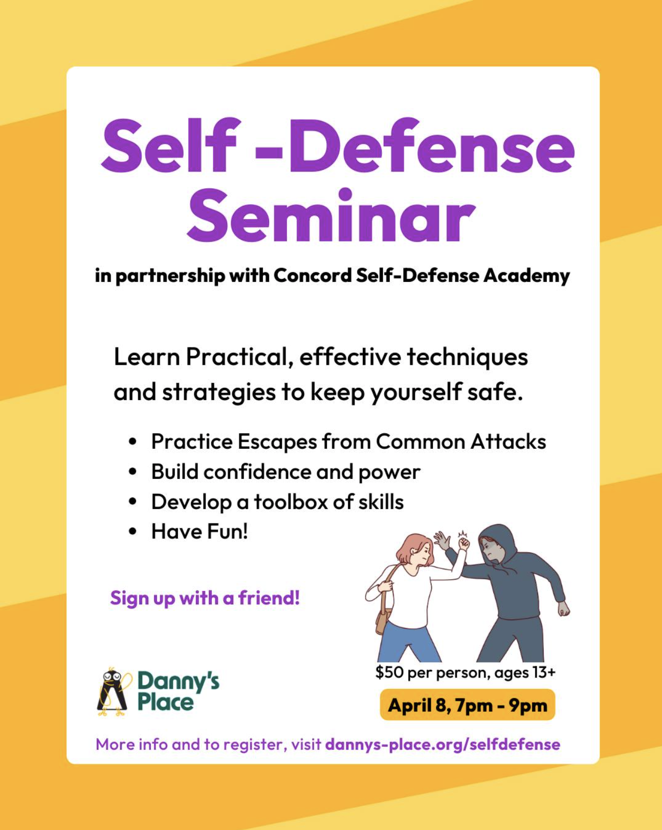 On April 8 at 7 PM, Danny's Place is partnering with Concord Self-Defense Academy for a hands-on self-defense workshop for ages 13+. Learn more and register here.